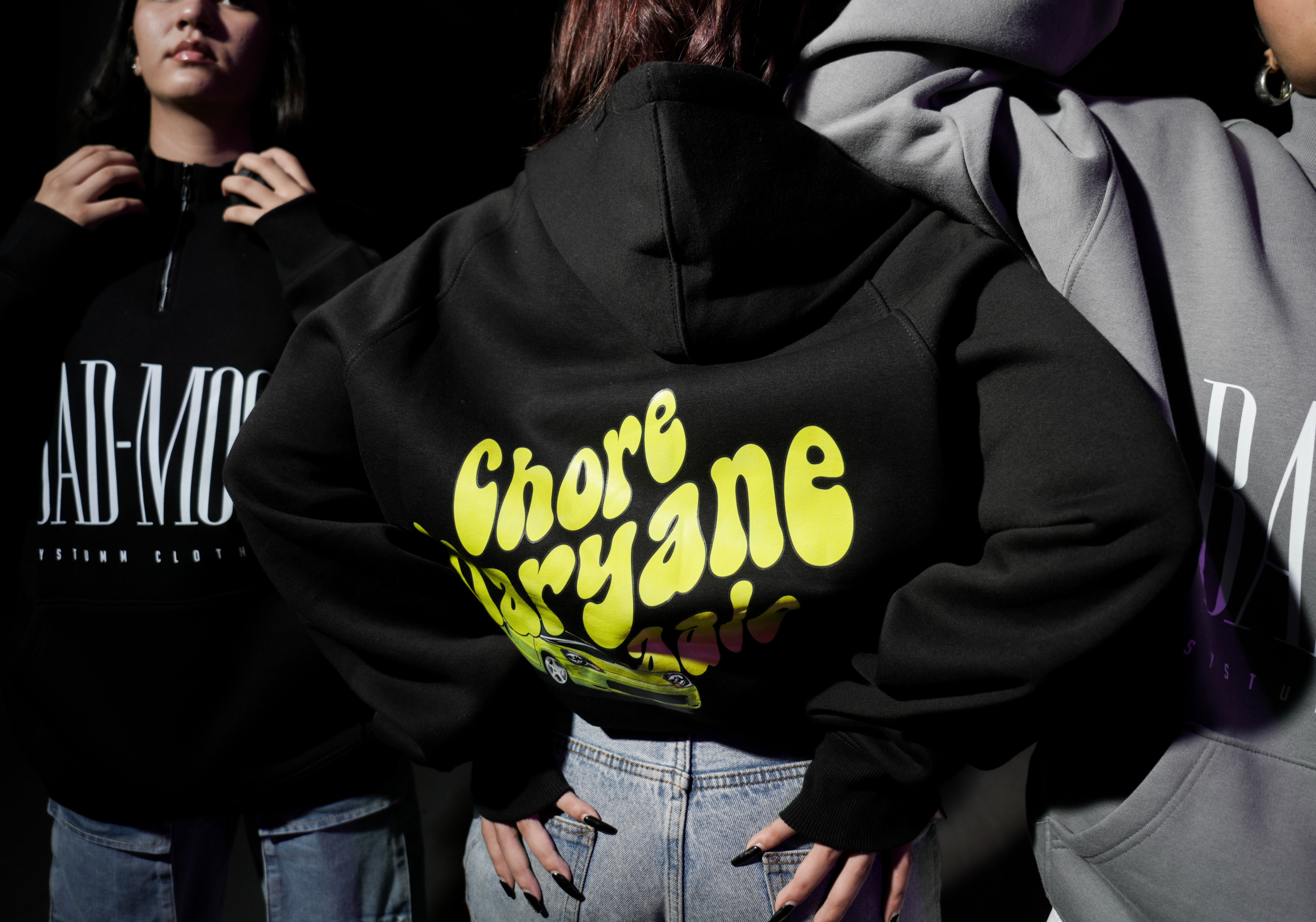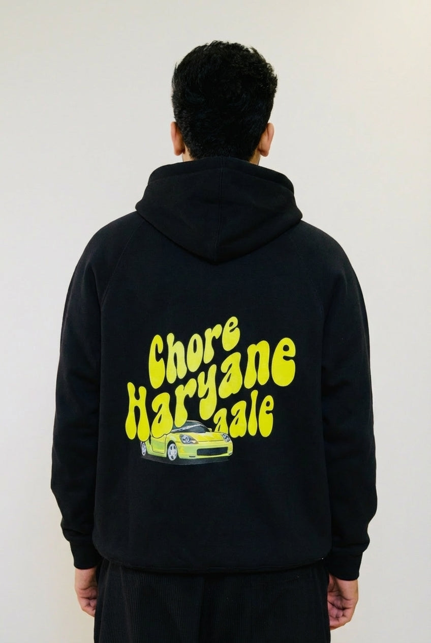 The Chore Haryana Hoodie is a statement piece that celebrates fearless confidence. Featuring bold graphic typography and a striking car illustration on the back, this hoodie turns heads while keeping the front clean and wearable.